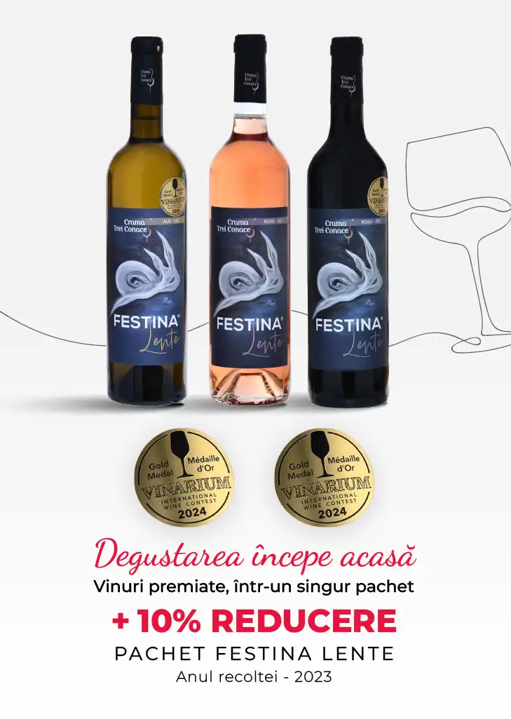 Pachetul contine 3 sticle de vin Festina Lente din recolta 2023 si 10% reducere aplicata: