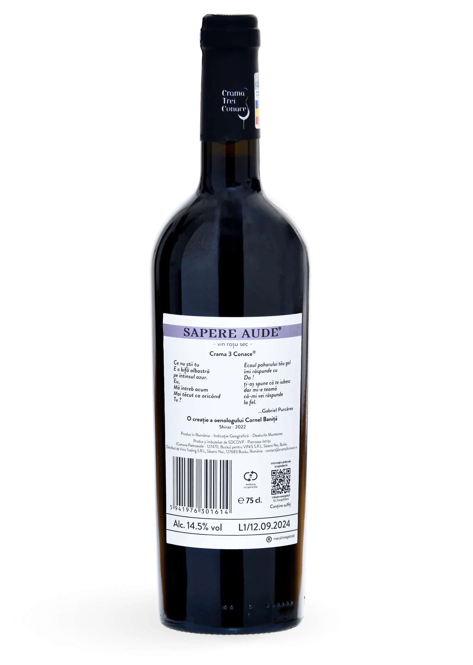 Un Shiraz dintr-o podgorie de pe Dealu Mare, acest vin este maturat în butoaie de stejar pentru un profil aromatic complex și bine structurat. Sapere Aude exprimă o abordare modernă, concentrată pe calitate, expresie autentică și care demonstrează ca Shiraz, se poate cultiva și în România.